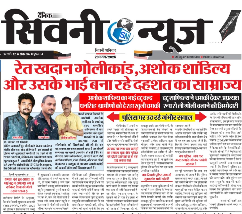 19 नवंबर को सिवनी की रेत खदान में हुए गोलीकांड ने अब एक बेहद गंभीर और नया मोड़ ले लिया है। इस मामले में पुलिस की शुरुआती कार्रवाई पर पहले से ही सवाल उठ रहे थे, लेकिन अब एक चौंकाने वाला खुलासा हुआ है। प्राप्त रिपोर्ट और पुलिस के पास दर्ज एक गैर-संज्ञेय रिपोर्ट (NCR) के अनुसार, रेत ठेकेदारों को लगातार ब्लैकमेल करने और क्षेत्र में दहशत फैलाने के आरोपी अशोक शांडिल्य के भाई दद्दू वल्द धनसिंह शाण्डिल्य ने एक ग्रामीण को खुली धमकी दी है और अप्रत्यक्ष रूप से गोलीकांड की जिम्मेदारी भी ली है।